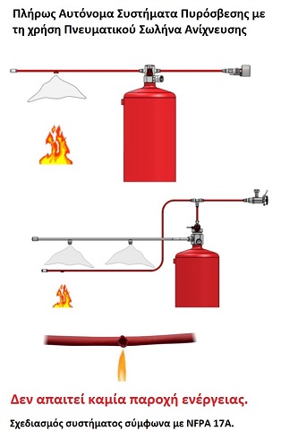 Με την εκδήλωση φλόγας και την υπέρμετρη αύξηση θερμότητας, το υπό πίεση σωληνάκι διαρρηγνύεται και μέσω αποσυμπίεσης ανοίγει το κλείστρο του πυροσβεστήρα. Το κατασβεστικό υλικό απελευθερώνεται μέσω του εγκατεστημένου χαλκοσωλήνα και των ειδικά σχεδιασμένων ακροφυσίων που εστιάζουν τις πιθανές περιοχές κινδύνου. Είναι ευέλικτο και γρήγορης δράσης.